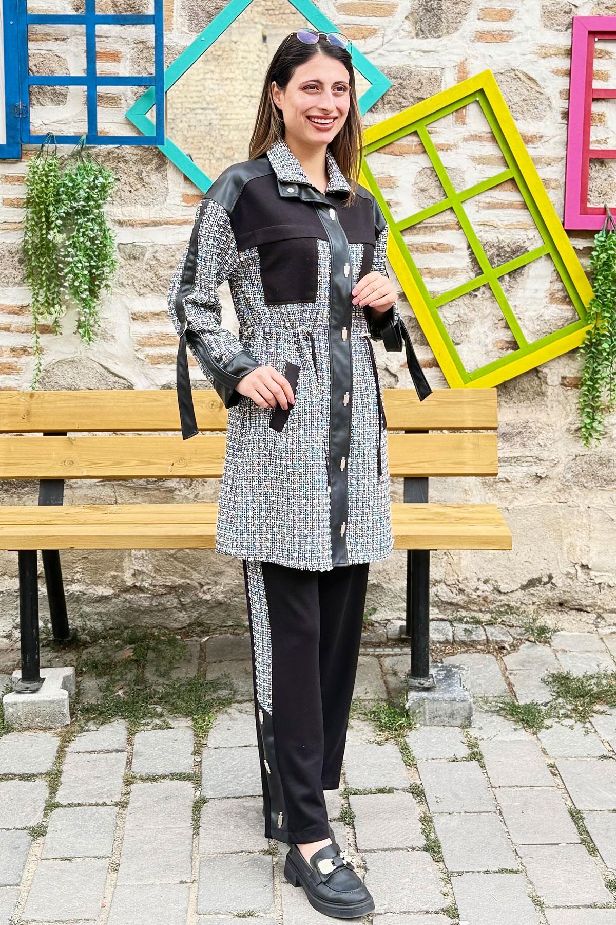 Deri Garnili Çıtçıtlı Tüvit Pantolonlu Takım